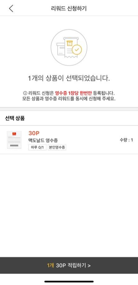 그렇게 되면 일반적으로 폰 사진찍듯이 화면이 나와요. 거기에 영수증을 평평한 곳에 구겨지지 않게 찍으면 위 화면처럼 뜹니다. 맨밑 30P 적립하기를 누르면 업로드가 되며 적립신청이 완료되었다고 뜹니다.